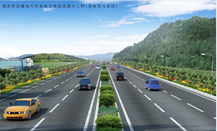 該項目是二級公路拓寬為一級公路,路基總寬度23~33米,路面結構類型為瀝青混凝土路面,為配合道路工程的提升,在路基兩側設置綠化帶,路線起于綿陽市二環路吳家鳳凰立交,沿現有道路前行,經吳家鎮、楊家鎮、玉皇鎮,止于涪城區與中江縣交界處。