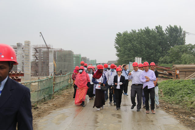 項目部首先向桑給巴爾客人介紹了公司基本情況以及郎溪路四標項目的概況、工程質量、進度、安全文明管理等工作,隨后去施工現場進行了觀摩。