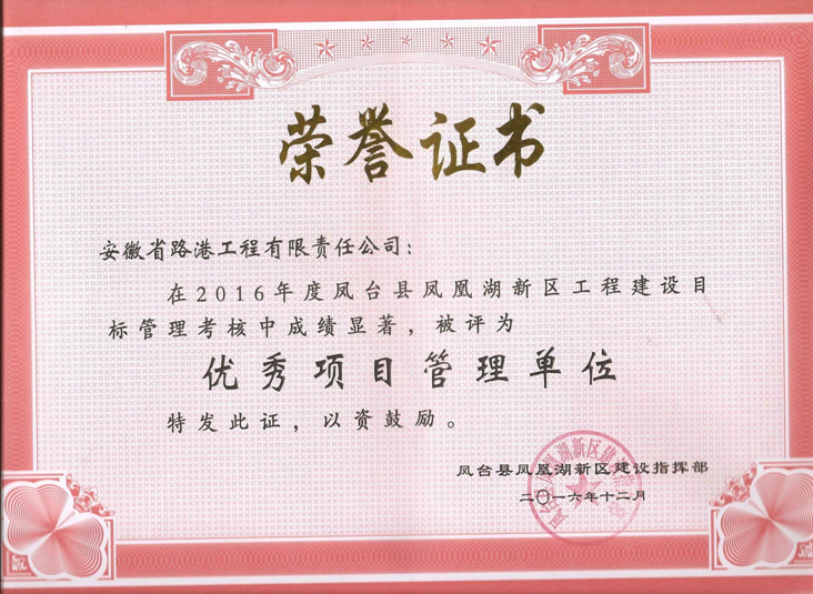 近日,安徽路港鳳臺縣鳳凰湖新區項目部在業主2016年度目標管理考核中成績優異,被授予“優秀項目管理單位”榮譽稱號,項目負責人被授予“優秀項目經理”榮譽稱號。