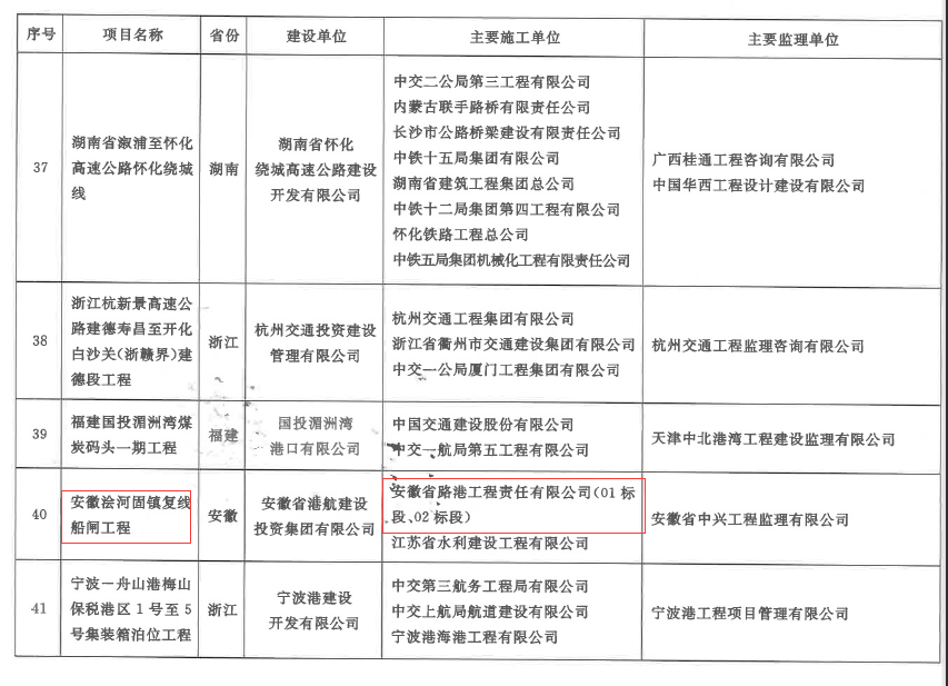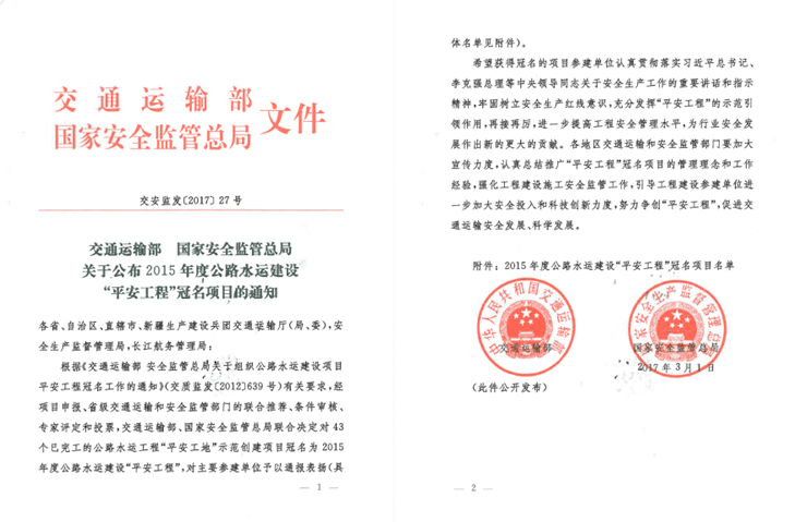 近日,由安徽路港公司承建的安徽省澮河固鎮復線船閘項目榮獲2015年度公路水運建設“平安工程”冠名。該獎項由交通運輸部和國家安全監管總局聯合頒發,全國共43個項目獲獎。這是安徽路港公司繼黃祁高速路面03標后再獲此項殊榮。