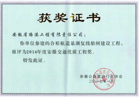 由安徽路港公司承建的合裕航道巢湖復線船閘建設工程、蚌淮高速高塘湖特大橋工程、徐州至明光高速公路安徽段榮獲2016年度“安徽交通優質工程獎”。 “安徽交通優質工程獎”由安徽省公路建設行業協會組織評選,經建設施工單位申報,項目主管部門推薦,專家委員會評審,網上公示,并報省交通運輸廳備案。 此次3個項目獲得該項榮譽,進一步鞏固了公司在省內交通系統的品牌影響力。