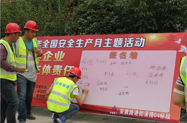 (圖為合肥市郎溪路高架項目部舉辦“安全生產月”宣誓簽名活動)
