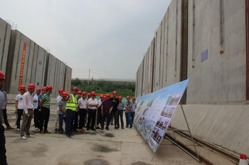 在施工現場,項目負責人結合現場的宣傳展板就項目場地布設標準化、施工工藝標準化、管理行為標準化、創新標準化、輕型移動門架支撐系統施工工藝、工程進展情況及采取的質量管控措施向觀摩團進行了介紹。觀摩團成員在現場對閘室墻身、閘首廊道、邊墩空箱進行了察看,仔細詢問了施工工藝、質量控制、技術創新等方面的問題。布置整潔的施工場地,標準化的安全防護,規范化的施工工藝,內實外美的施工質量,讓觀摩人員連連稱贊。