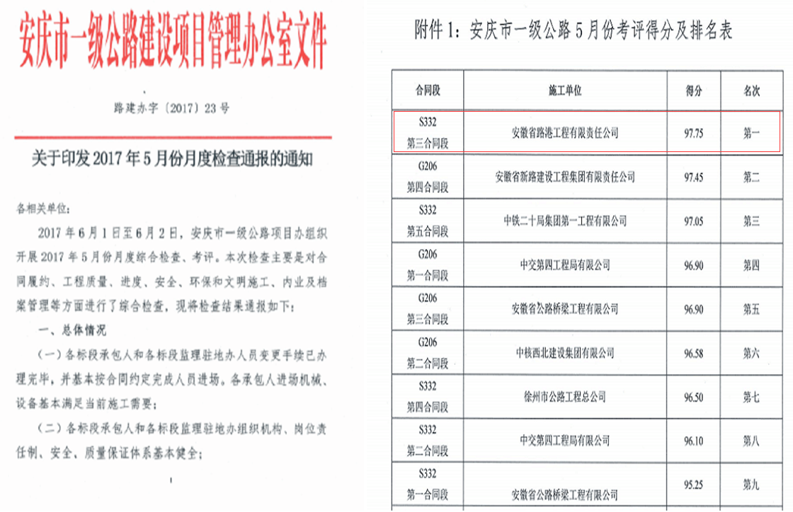 近日,安徽路港S332安慶改建工程施工三標項目部在建設單位5月份月度考評的9家施工單位中過關斬將、一路領先,在合同管理、質量管理、安全管理、文明管理及進度等方面,以綜合評分97.75分的好成績,再次獲得5月份綜合考評第一名,這是該項目部自4月份獲得月度考評第一名后,連續兩次獲得此項殊榮。