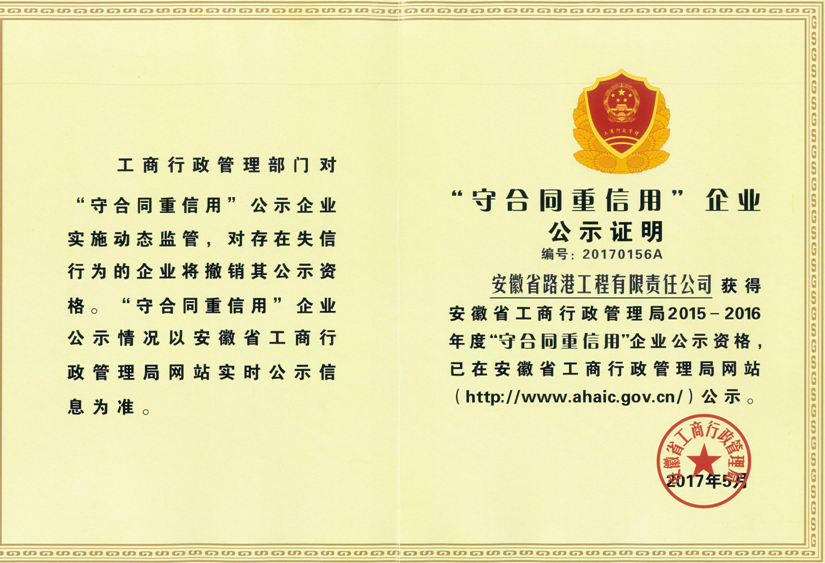 日前,安徽省工商行政管理局授予安徽路港公司“2015-2016年度省級守合同重信用企業”稱號。
