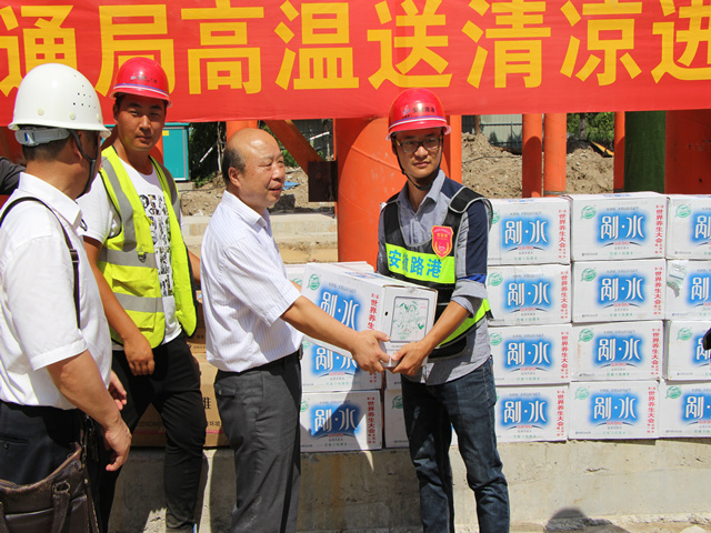 7月19日上午,蕪湖市交通運輸局黨委委員、總工程師沈朝榴在港航管理局副局長詹應線、項目辦主任牧啟標等同志陪同下,蒞臨安徽路港蕪湖市中山橋改建工程項目進行“高溫送清涼下工地”慰問活動,為冒高溫、戰酷暑的一線建設者們發放了仁丹、清涼油、十滴水、毛巾、香皂及礦泉水等防暑降溫用品,并向全體建設者致以親切慰問。