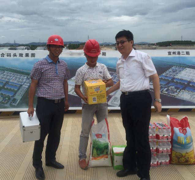 8月1日上午,安徽省港航建設投資集團董事長李家俊在項目辦主任丁龍喜的陪同下,赴安徽路港承建的宣州港項目“送清涼”。