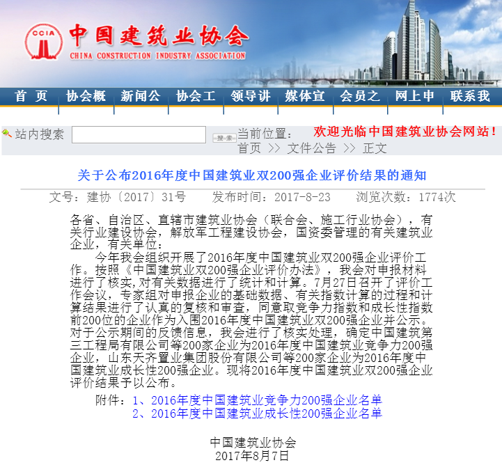 8月23日,中國建筑業協會在其官方網站公布了2016年度中國建筑業雙200強企業評價結果,安徽省路港工程有限責任公司獲“2016年度中國建筑業成長性200強企業”榮譽稱號。