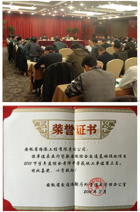 3月7日,亞行貸款安徽綜合交通基礎設施項目2016年度建設管理會議在合肥召開,會議對2015年度綜合考評結果進行了通報,安徽路港G206東流至堯渡段建設工程02標項目榮獲全省施工單位綜合考評第三名佳績。