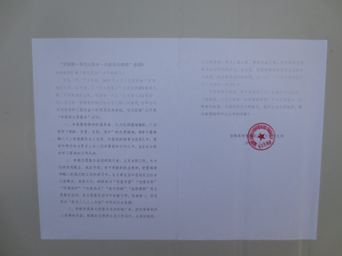團員青年們也用自己的行動不斷挖掘和深化雷鋒精神的時代內涵。團支部通過懸掛宣傳橫幅、張貼倡議書,營造了濃厚的活動氛圍。同時組織開展了義務道路清掃、道路排水、義務清理生活垃圾、植樹護綠、衛生大掃除等活動,為建設美麗船閘創造良好的施工生活環境,營造了文明、和諧、向上的項目氛圍。