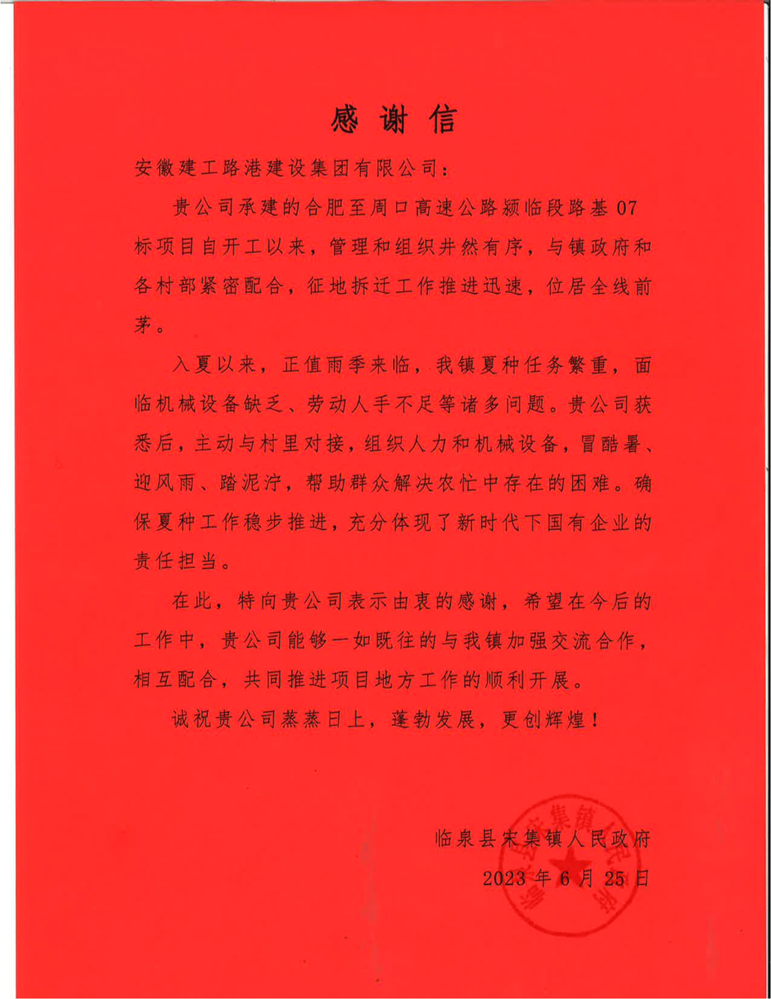 6月25日,路橋分公司合周高速潁臨段路基07標項目收到項目所在地臨泉縣宋集鎮人民政府感謝信,對項目部與地方政府緊密配合和給予的幫助表示感謝。