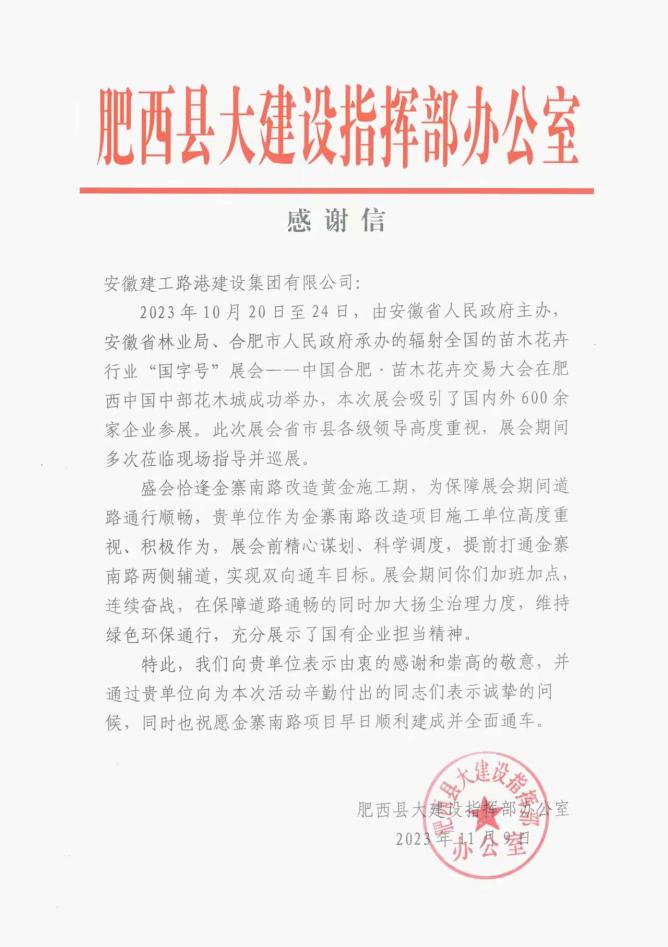 近日,金寨南路(站前路-深圳路)快速化改造2標項目收到肥西縣大建設指揮部感謝信,信中對項目在2023年中國合肥?苗木花卉交易大會舉辦期間的大力配合表示感謝。