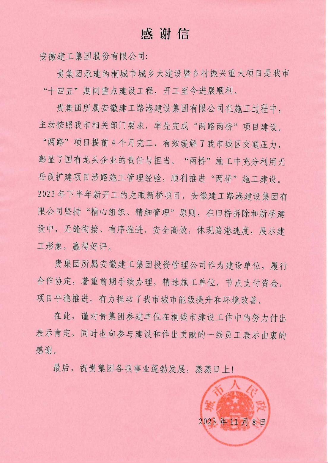 日前,桐城市人民政府給公司送來感謝信,對建工路港在桐城市建設工作中的努力付出表示肯定,向參與建設和作出貢獻的一線員工表示由衷的感謝。