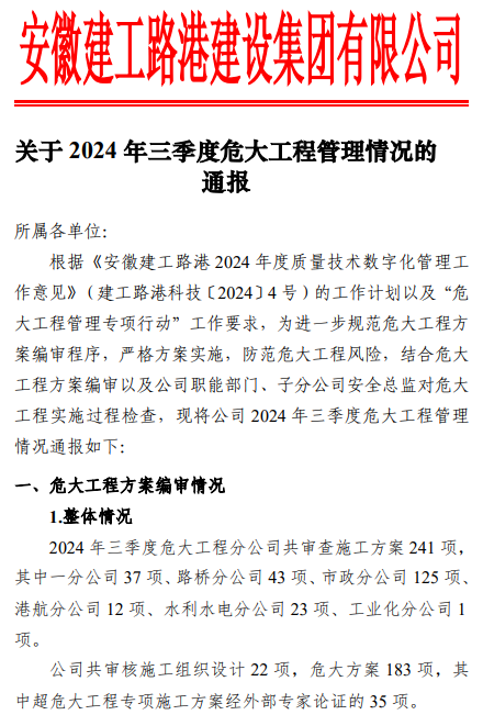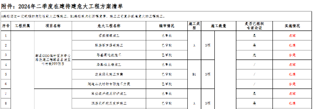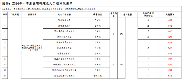 根據項目施工進度,每季度初梳理統計各子分公司項目部A類、B1類危大工程方案在建待建數量、編審及專家論證情況,2024年一季度在建待建危大工程方案共242項,二季度244項,三季度289項,四季度267項,通過及時更新在建待建危大工程清單,幫助各級管理人員掌握項目危大工程實施動態,在班前會、過程檢查、帶班檢查、安全巡查時給予重點關注并記錄。