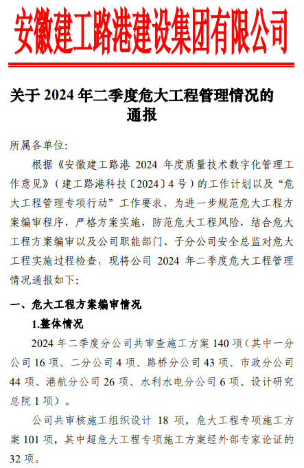 結合危大工程專項施工方案編審以及公司職能部門、子分公司安全總監對危大工程實施過程檢查情況,梳理總結每季度危大工程管理情況,主要通報方案編審常見問題、實施過程檢查發現的不足,并提出有關工作意見。
