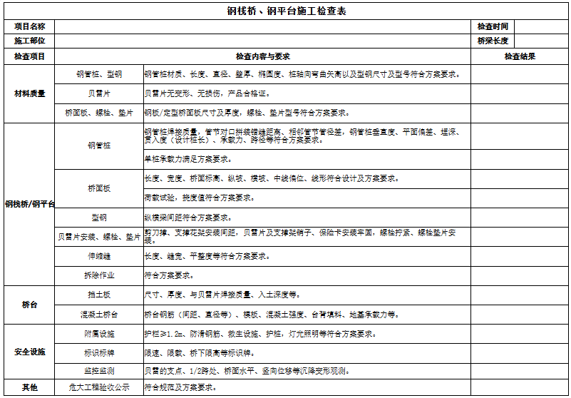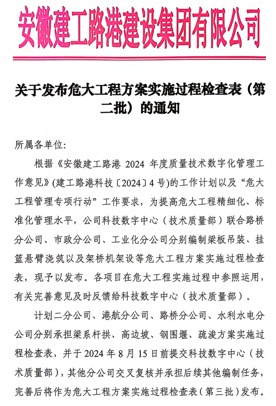 科技數字中心(技術質量部)聯合安全管理部、各分公司共同編制,分批發布了支架施工、深基坑施工、鋼棧橋及鋼平臺施工、梁板吊裝、掛籃懸臂澆筑、架橋機架設方案6項常見的危大工程實施過程檢查表,危大工程實施驗收檢查中參照使用,可以更全面、更好地指導危大工程實施,提高危大工程精細化、標準化管理水平。