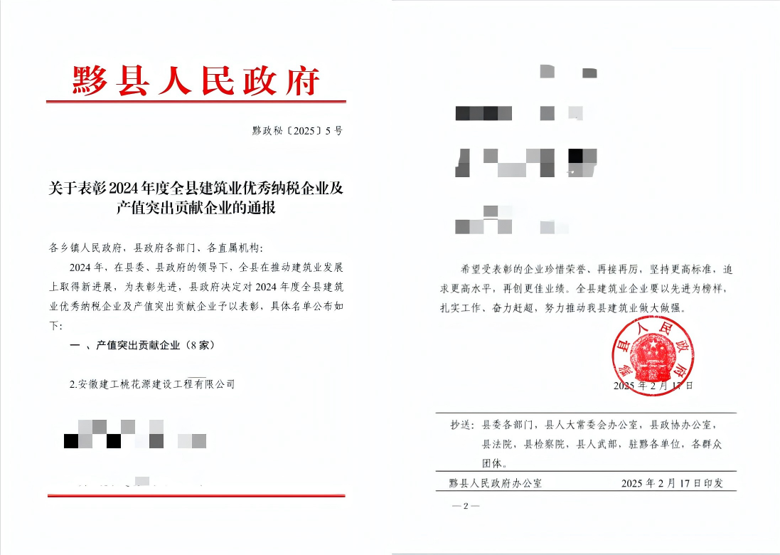 近日,黟縣人民政府發布《關于表彰2024年度全縣建筑業優秀納稅企業及產值突出貢獻企業的通報》,對在2024 年度為全縣建筑業發展作出突出貢獻的企業予以表彰,安徽建工桃花源建設工程有限公司位列“產值突出貢獻企業”第2名。
