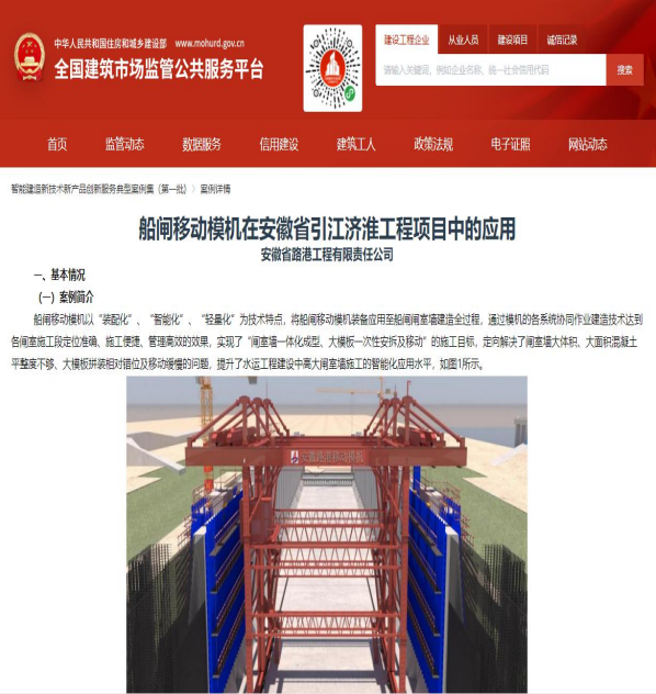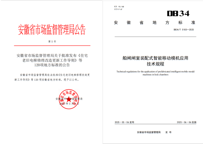 近日,安徽省市場監督管理局發布了2025年度安徽省地方標準公告名單,建工股份、建工路港公司主編的《船閘閘室裝配式智能移動模機應用技術規程》(DB34T 5183—2025)正式落地實施。該標準是全國首部針對船閘智能建造的技術規程,不僅為安徽船閘工程建造技術革新提供了堅實的規范指引,更標志著全國水運基礎設施建設領域邁入了新的里程。