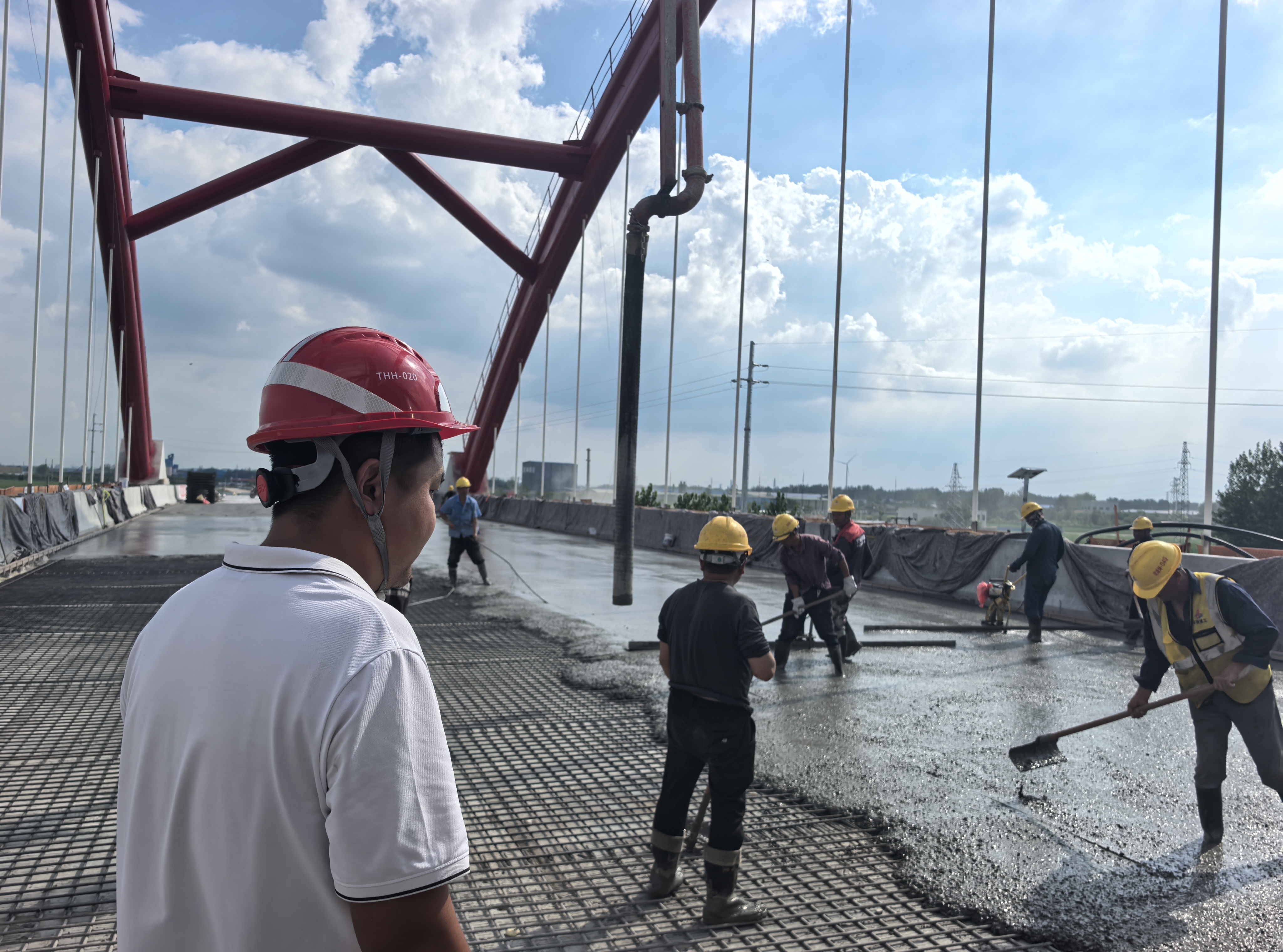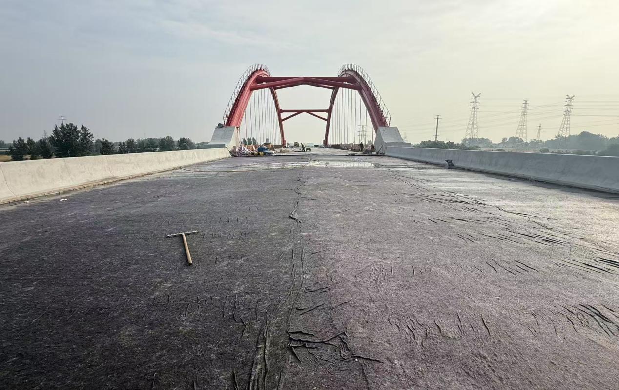沱澮河航道臨渙碼頭橋是連接安徽旅游十大古村鎮——臨渙古城和淮海戰役總前委指揮部舊址的關鍵要道,橋梁全長507.2m,橋面鋪裝總面積近8000㎡,施工期正值高溫季節。